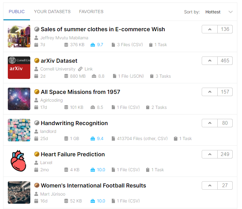 Kaggle의 Data 메뉴(https://www.kaggle.com/datasets)에서는 무료로 오픈 데이터 셋을 다운로드 받을 수 있습니다.