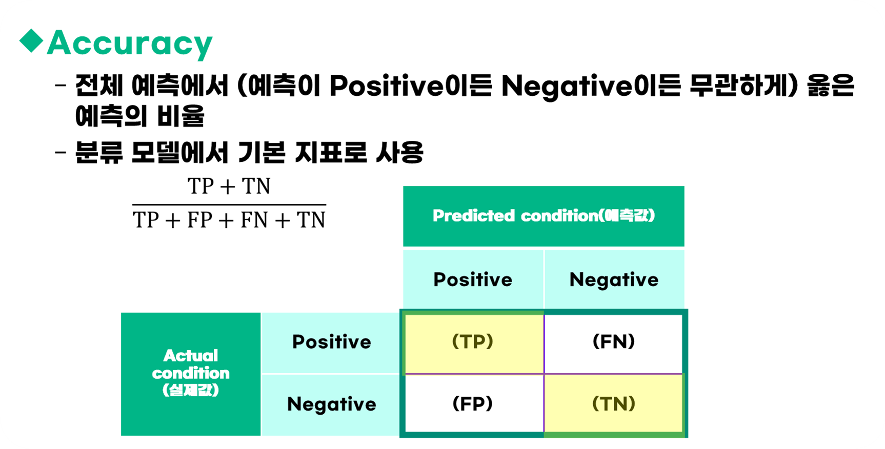 | True Negative (TN) | 실제로 부정인데 예측도 부정으로 함 | |