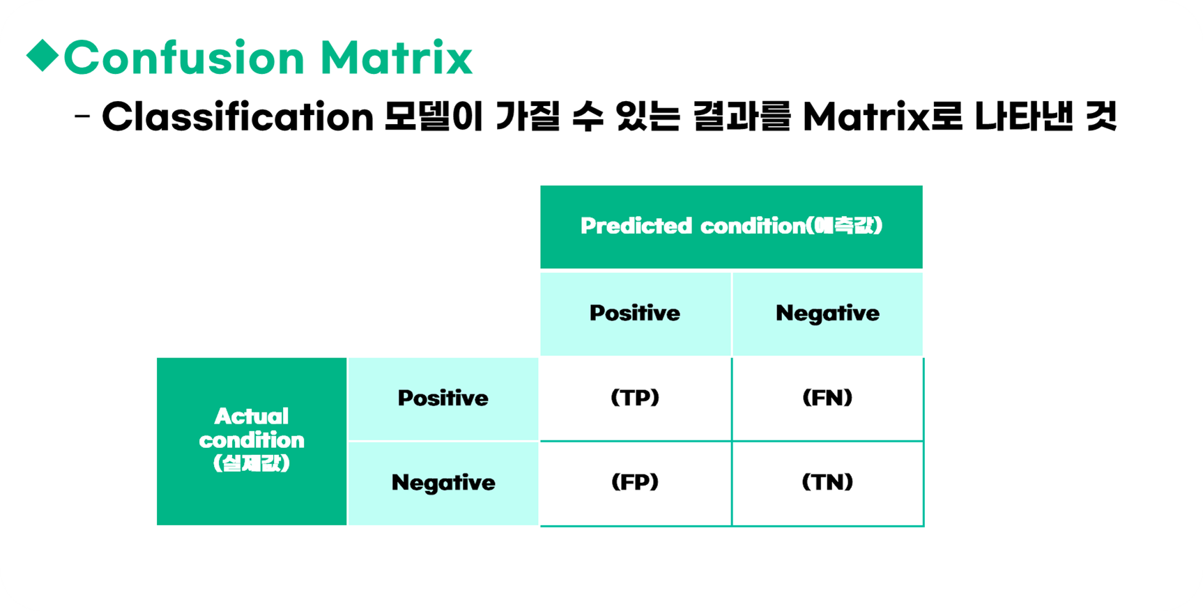 | False Negative (FN) | 실제로 부정인데 예측을 긍정으로 함 |