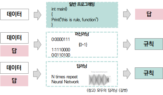 기존에 프로그래밍을 작성해본 경험이 있는 사람이라면, 위의 그림이 쉽게 이해가 될 것입니다. 프로그래머가 작성하던 코드를 머신러닝이나 딥러닝에서는 기계가 스스로 찾아냅니다. 프로그래머의 역할이 바뀌게 되는거죠. 머신러닝을 개발하는 개발자는 기계가 스스로 학습할 수 있도록 환경을 구성해주는 역할을 해줍니다. 데이터를 잘 정제해주고, 어떠한 과정을 통해서 학습하라는 명령을 내려주는거죠.