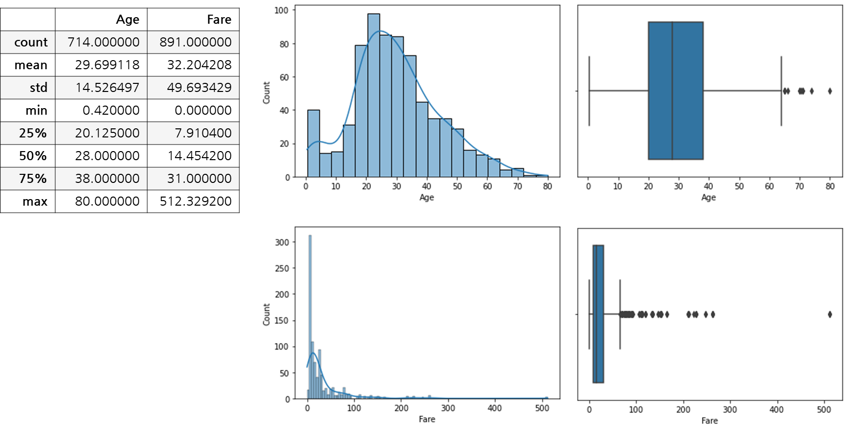 다음은 Titanic 데이터의 Age컬럼과 Fare컬럼의 데이터 분포를 나타냅니다.