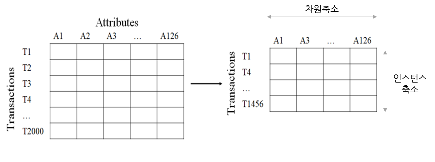 데이터 축소는 속성을 줄이느냐, 인스턴스를 줄이느냐에 따라 '차원축소'와 '인스턴스 축소'의 개념으로 나눠서 살펴 볼 수 있습니다.